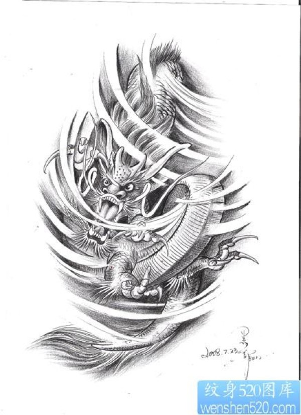 龙纹身手稿_一组老传统黑灰龙手稿纹身图案