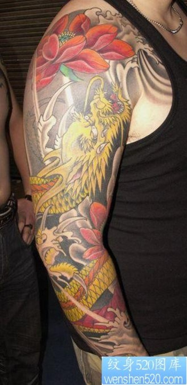 手臂龙莲花纹身图片_龙纹身图案大全_纹身图吧