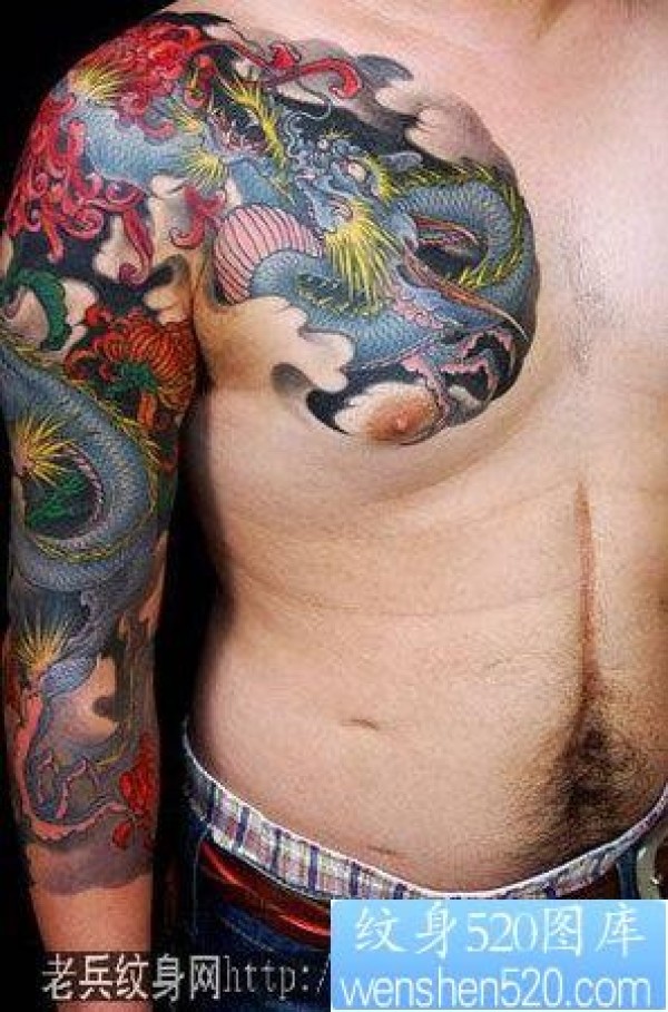 彩色半甲披肩龙菊花纹身图片纹身图案_龙纹身图案大全_纹身图吧