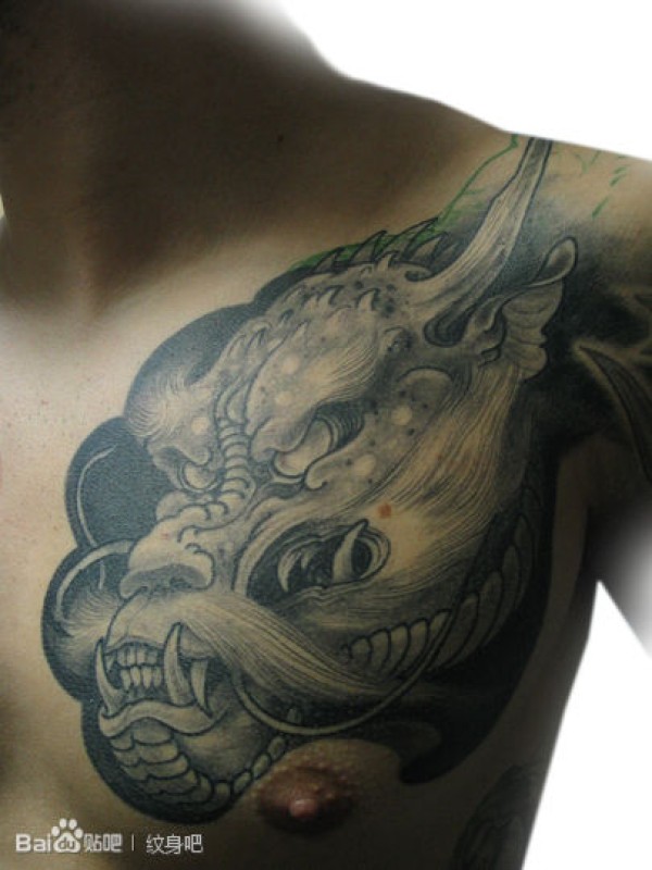 男人胸前时尚的黑灰龙头纹身图案_龙纹身图案大全_纹身图吧
