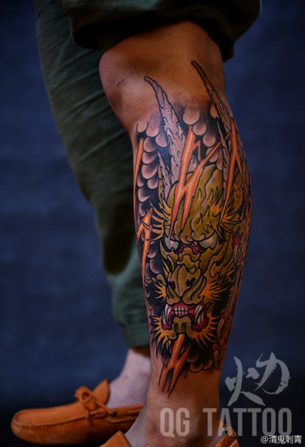 男人腿部时尚很酷的彩色龙头纹身图案_龙纹身图案大全_纹身图吧