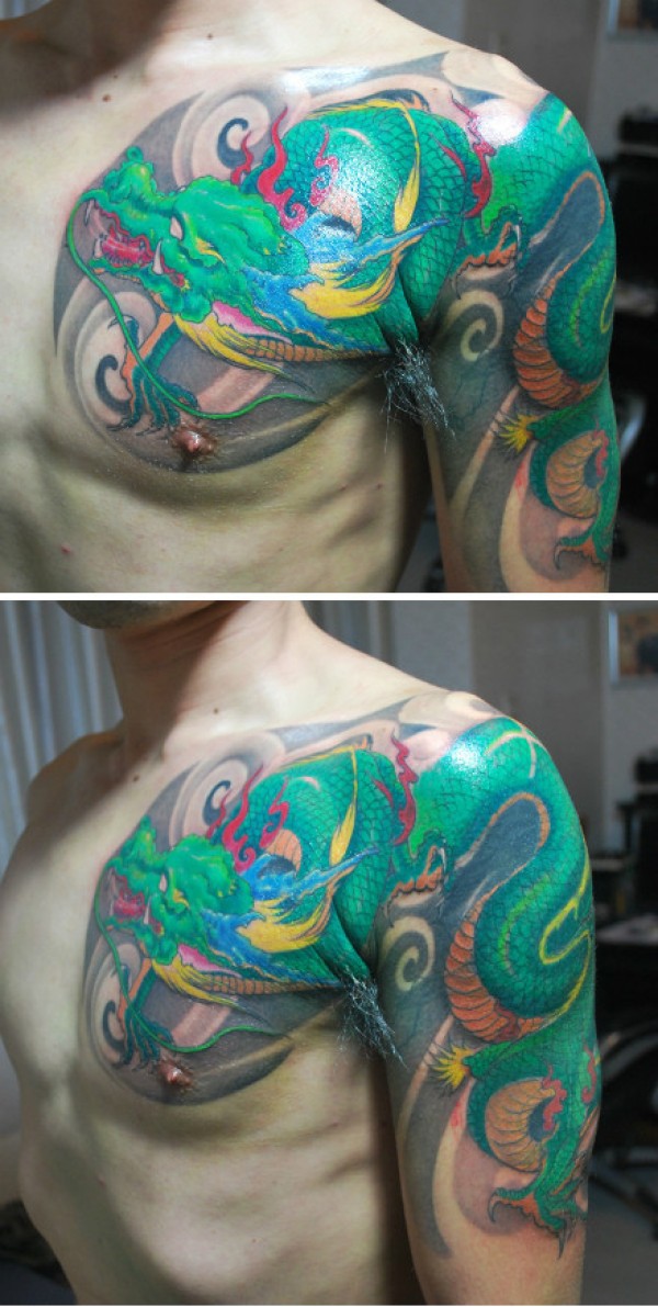 超帅的一款彩色半胛披肩龙纹身图案_龙纹身图案大全_纹身图吧