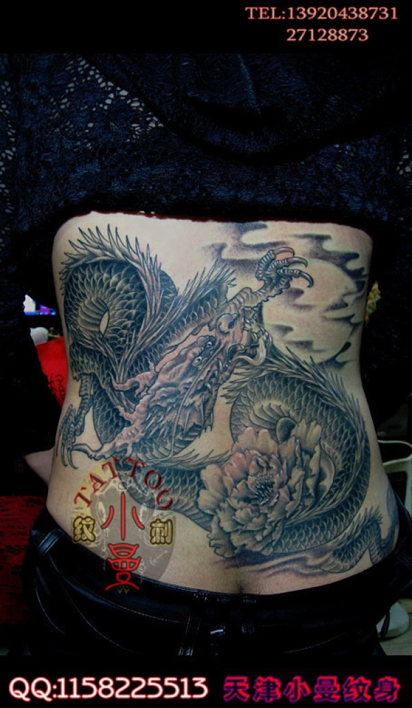 美女腰部时尚经典的龙戏牡丹纹身图案_龙纹身图案大全_纹身图吧