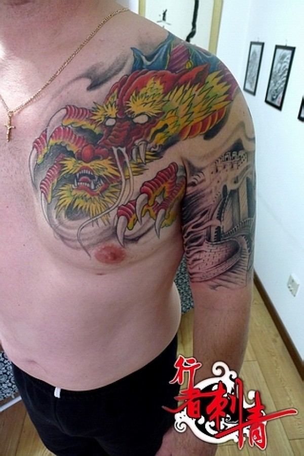 一款经典霸气的彩色披肩龙纹身图案_龙纹身图案大全_纹身图吧
