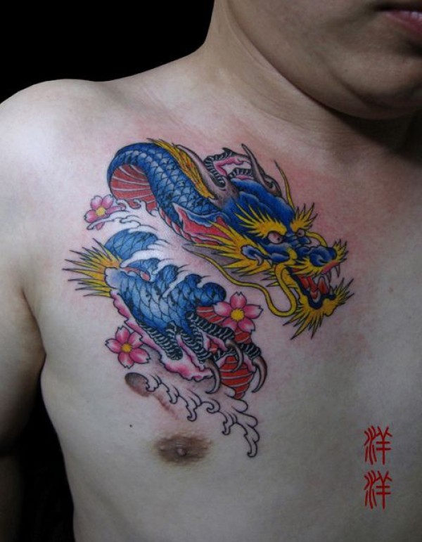 男人胸部帅气的彩色龙纹身图案_龙纹身图案大全_纹身图吧