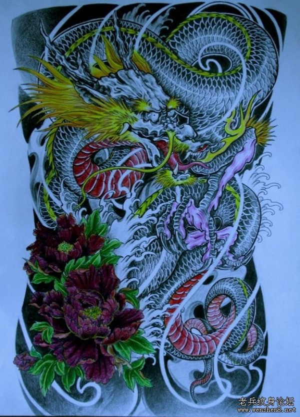 武汉最专业纹身店为你提供一款满背龙牡丹纹身_龙纹身图案大全_纹身图吧