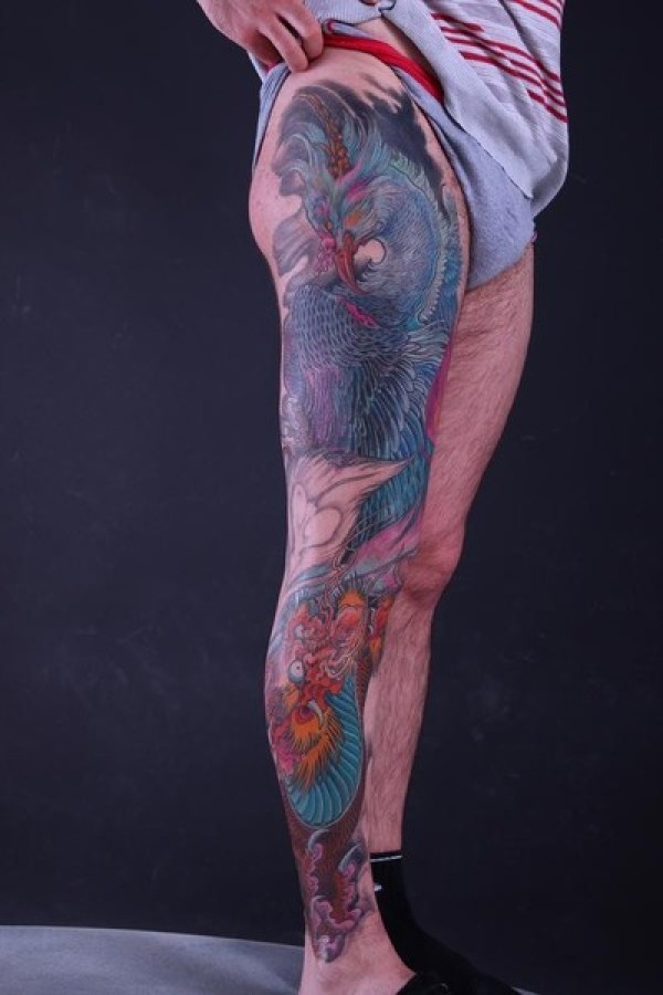 整腿彩色凤凰龙_龙纹身图案大全_纹身图吧