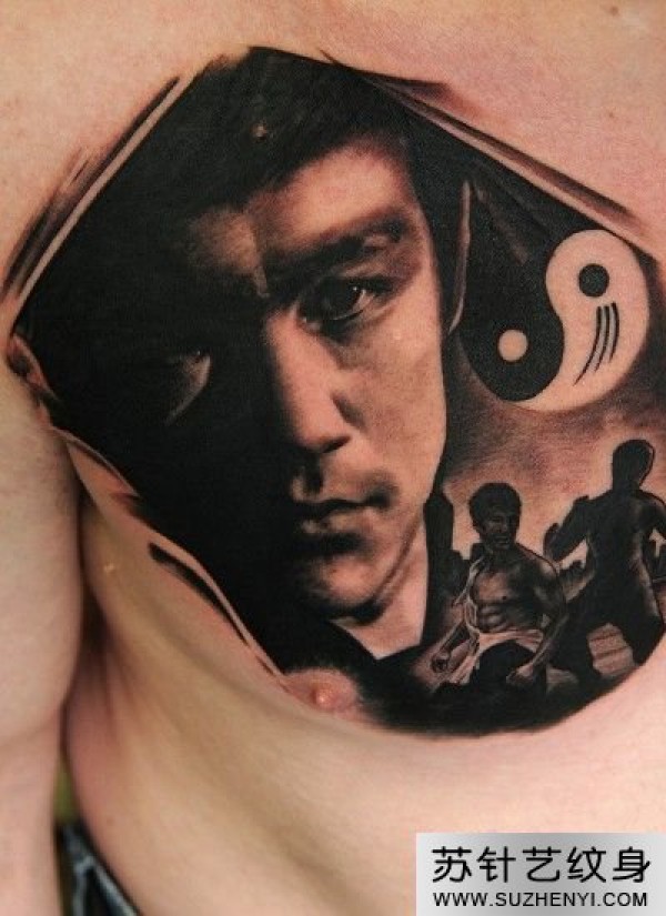 胸部李小龙头像纹身_龙纹身图案大全_纹身图吧