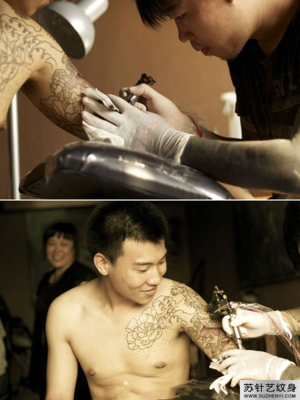 帅哥披肩龙与牡丹纹身_龙纹身图案大全_纹身图吧