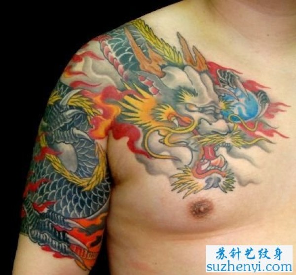 彩色过肩龙火焰纹身_龙纹身图案大全_纹身图吧