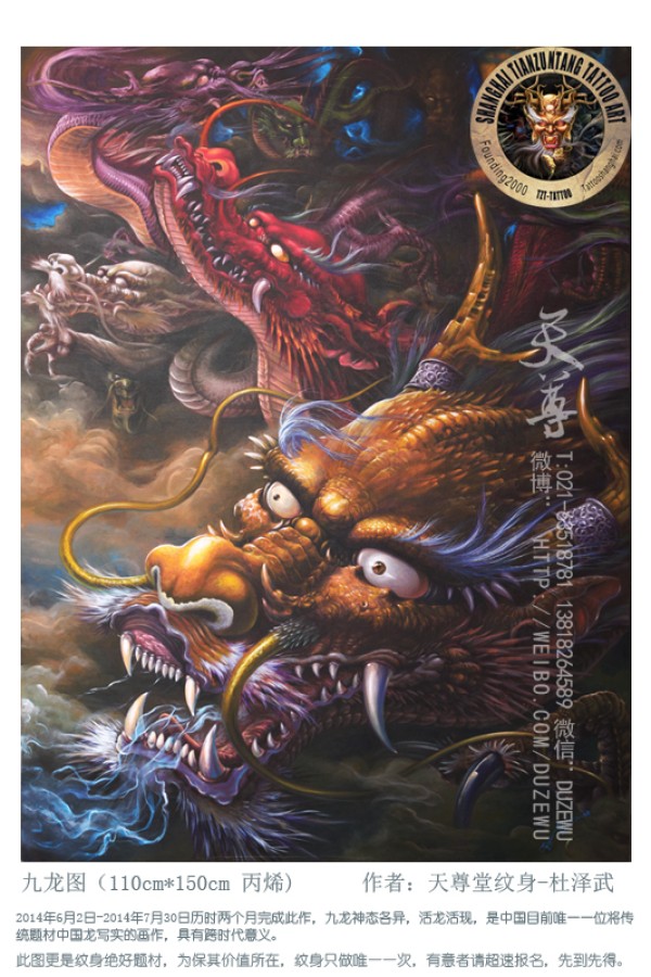一组满背大气九龙拉棺纹身图案作品和手稿