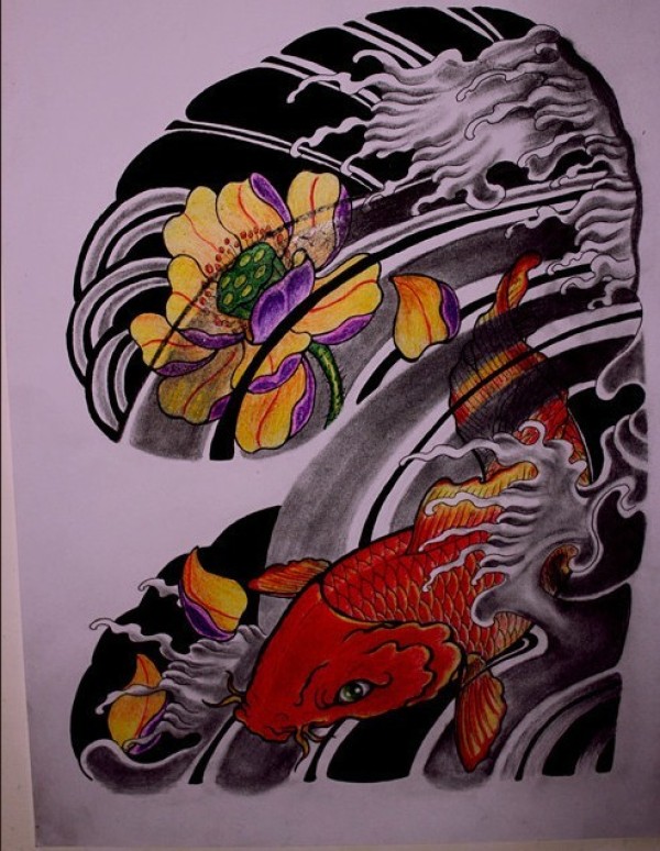 鲤鱼莲花纹身图案手稿_鲤鱼纹身图案大全_纹身图吧