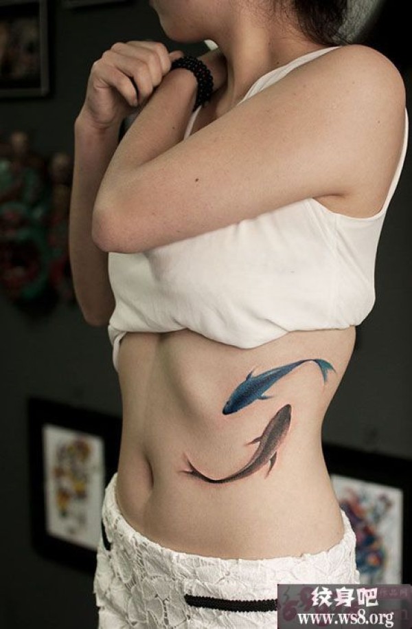 腰部上的水墨风shuangliyu双鲤鱼_鲤鱼纹身图案大全_纹身图吧