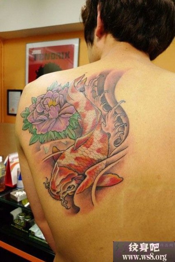 后肩传统牡丹鲤鱼刺青图案_鲤鱼纹身图案大全_纹身图吧