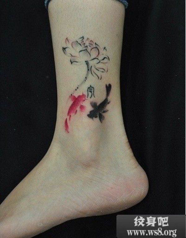荷花鲤鱼环绕小腿纹身图案_鲤鱼纹身图案大全_纹身图吧