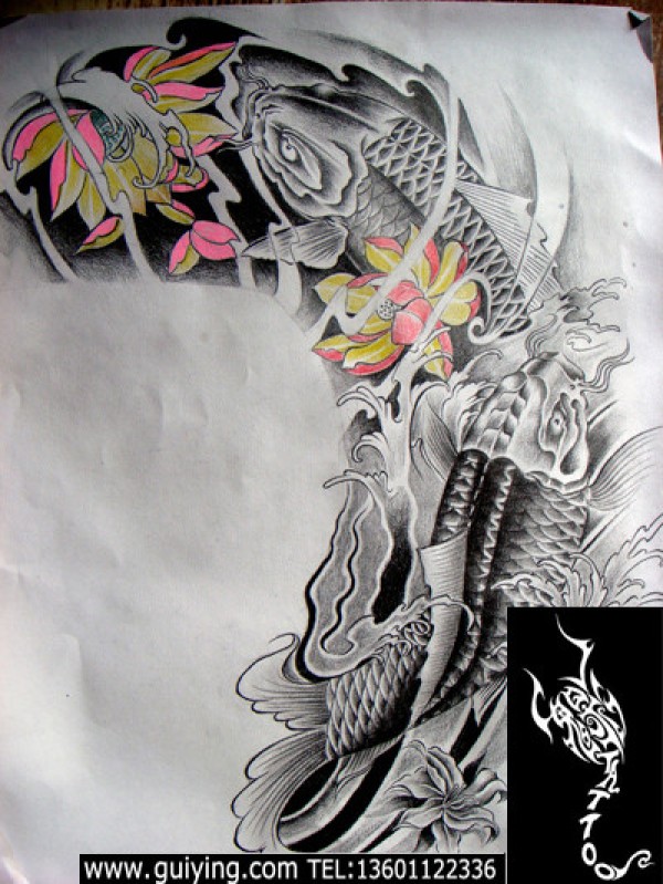 鲤鱼莲花纹身图案手稿_鲤鱼纹身图案大全_纹身图吧