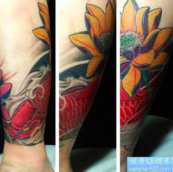 小腿红鲤鱼荷花纹身图案_鲤鱼纹身图案大全_纹身图吧