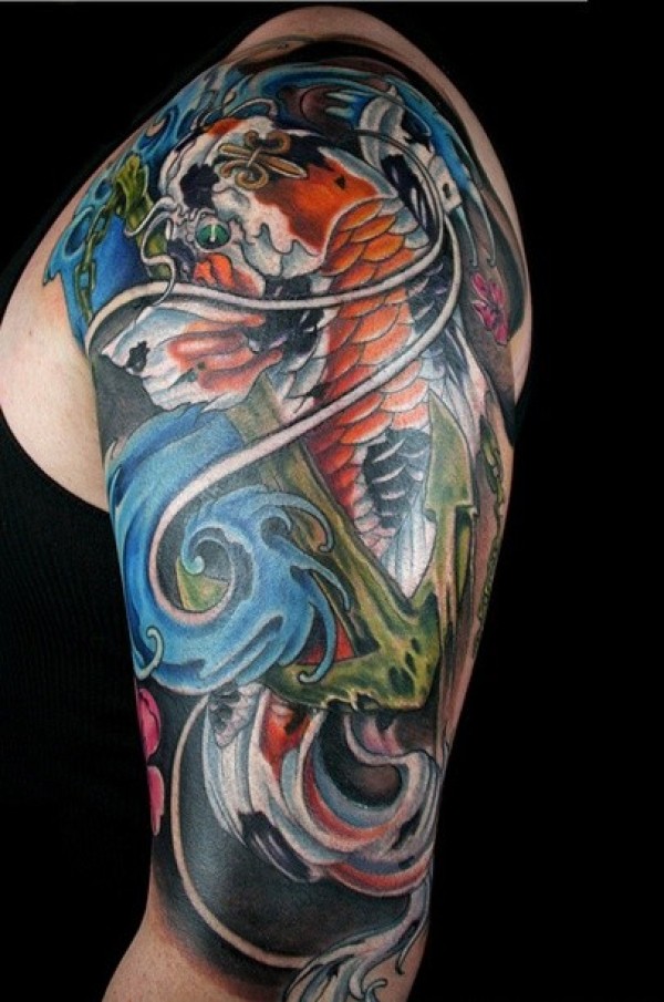 手臂彩色樱花鲤鱼纹身图片由纹身520图库推荐_鲤鱼纹身图案大全_纹身图吧