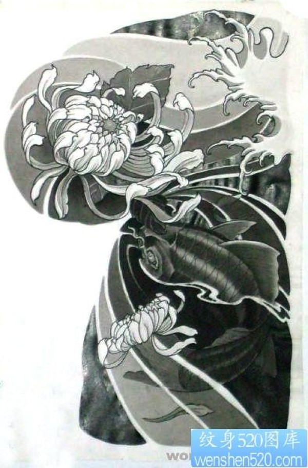 中国传统纹身图片之半胛鲤鱼菊花纹身图片作品_鲤鱼纹身图案大全_纹身图吧