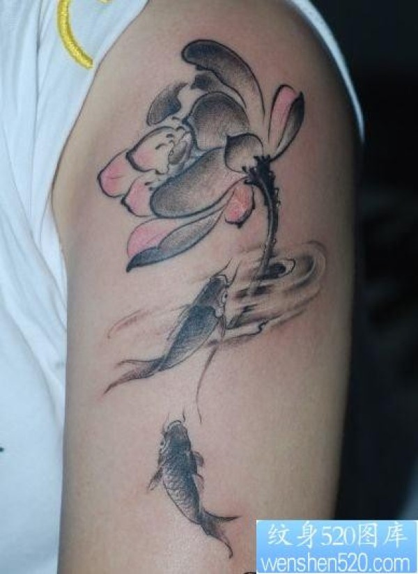 手臂流行的水墨画风格莲花鲤鱼纹身图片_鲤鱼纹身图案大全_纹身图吧