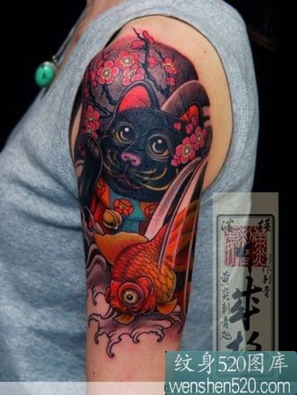 彩色猫头和鲤鱼纹身作品_鲤鱼纹身图案大全_纹身图吧