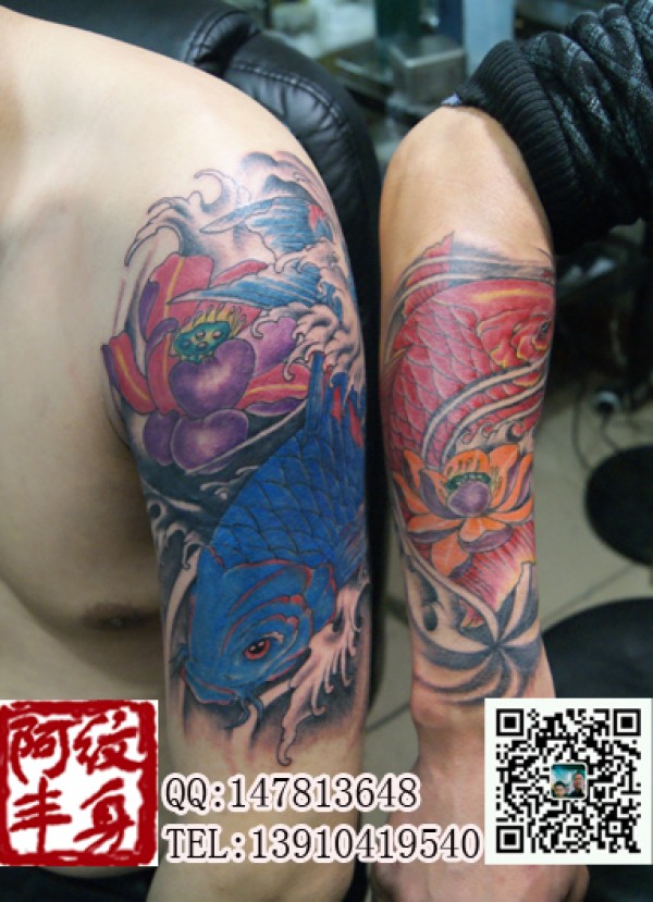 臂膀和小臂上的彩色鲤鱼纹身对比两款鲤鱼纹身_鲤鱼纹身图案大全_纹身图吧