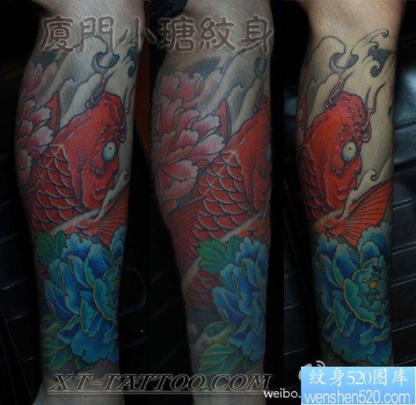 腿部经典的传统鲤鱼牡丹纹身图片_鲤鱼纹身图案大全_纹身图吧
