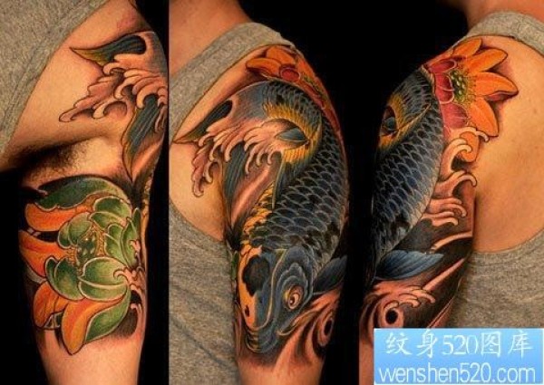 男生手臂漂亮的彩色鲤鱼莲花纹身图片_鲤鱼纹身图案大全_纹身图吧