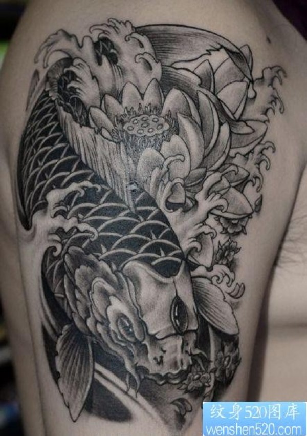 手臂好看的黑灰鲤鱼莲花纹身图片_鲤鱼纹身图案大全_纹身图吧