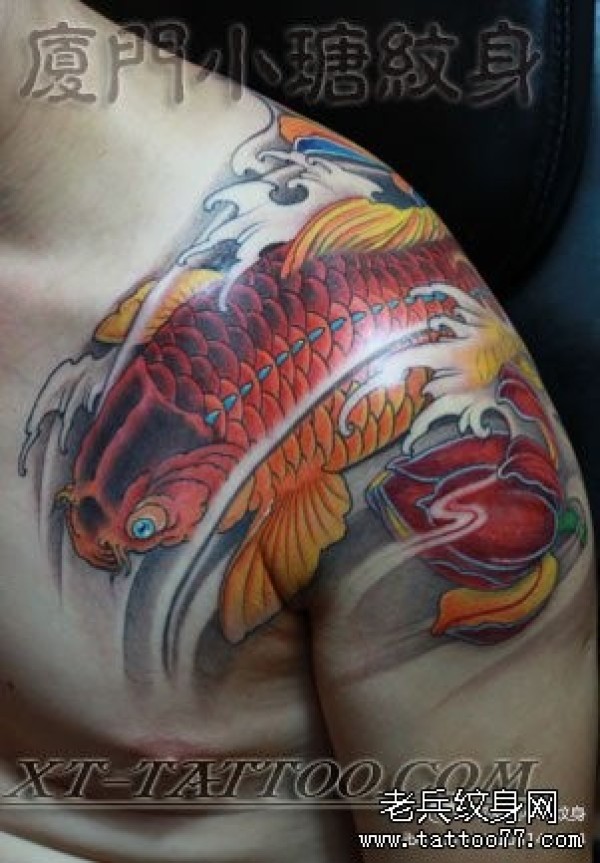 漂亮的彩色过肩鲤鱼纹身图片_鲤鱼纹身图案大全_纹身图吧