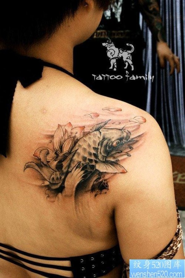 美女肩背唯美的黑灰鲤鱼纹身图片_鲤鱼纹身图案大全_纹身图吧