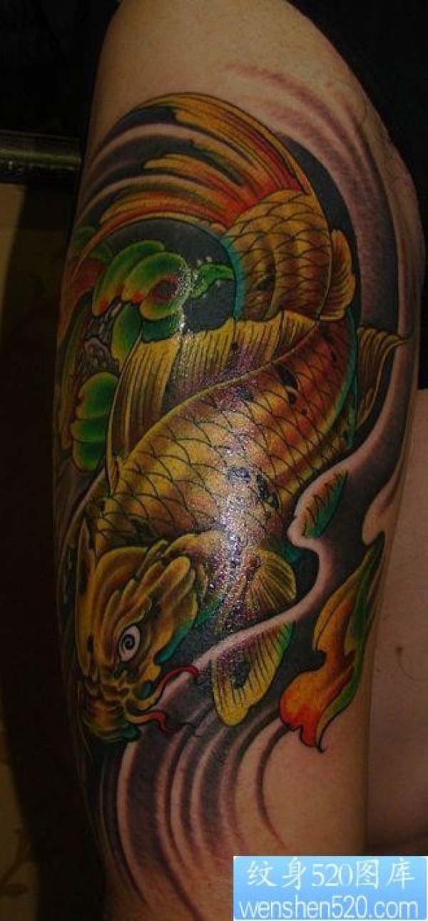 腿部彩色鲤鱼莲花纹身图片_鲤鱼纹身图案大全_纹身图吧