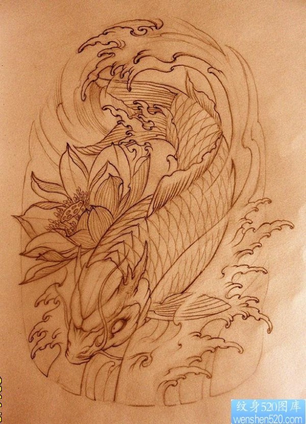 鲤鱼莲花纹身图案手稿_鲤鱼纹身图案大全_纹身图吧
