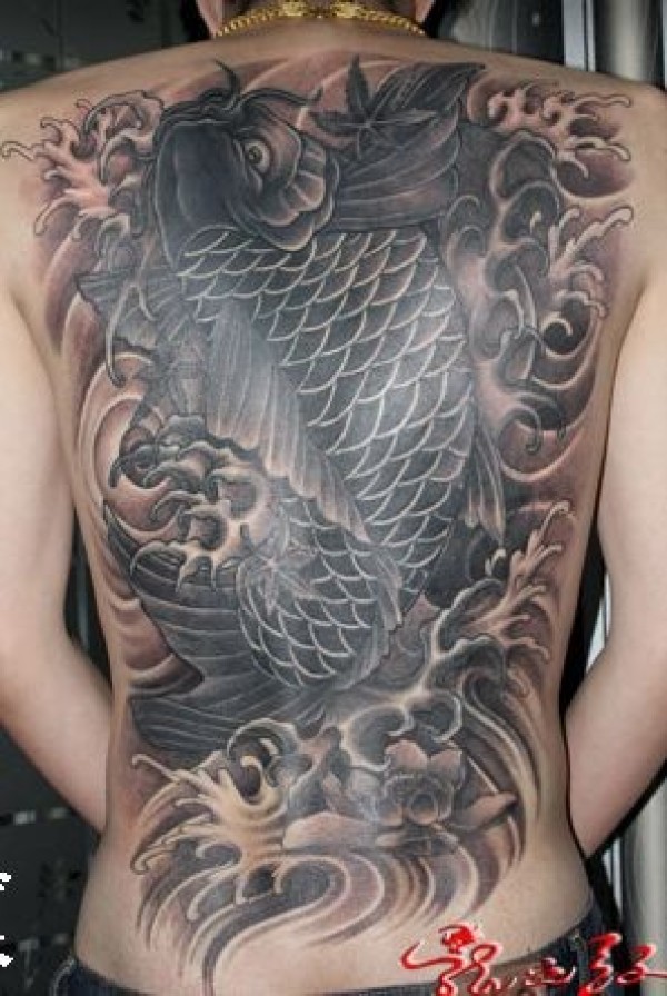 满背黑灰鲤鱼纹身图片_鲤鱼纹身图案大全_纹身图吧