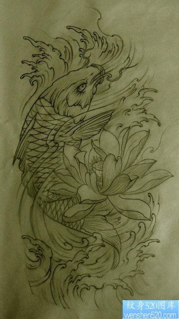 鲤鱼莲花纹身图案手稿_鲤鱼纹身图案大全_纹身图吧
