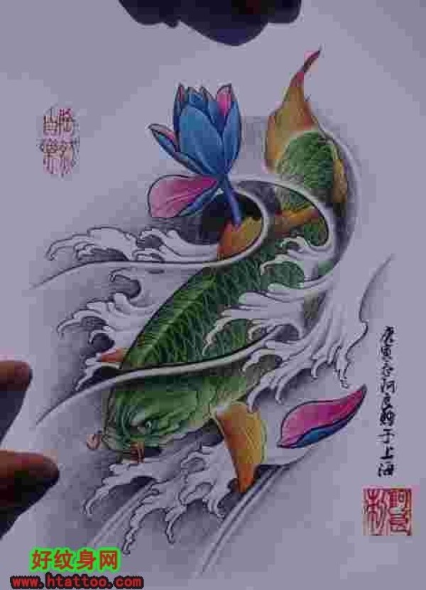 鲤鱼莲花纹身图案手稿_鲤鱼纹身图案大全_纹身图吧