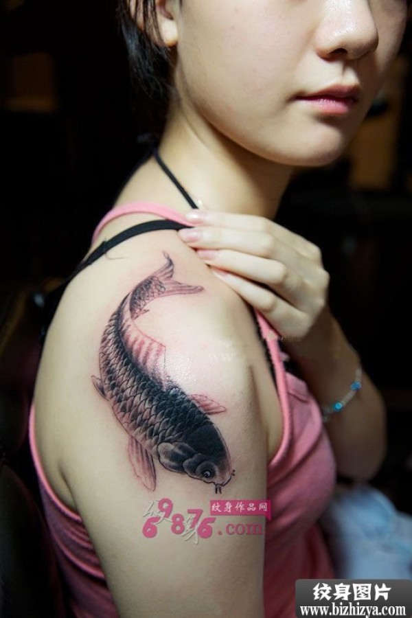 清纯妹子传统鲤鱼肩部纹身图案图片_鲤鱼纹身图案大全_纹身图吧