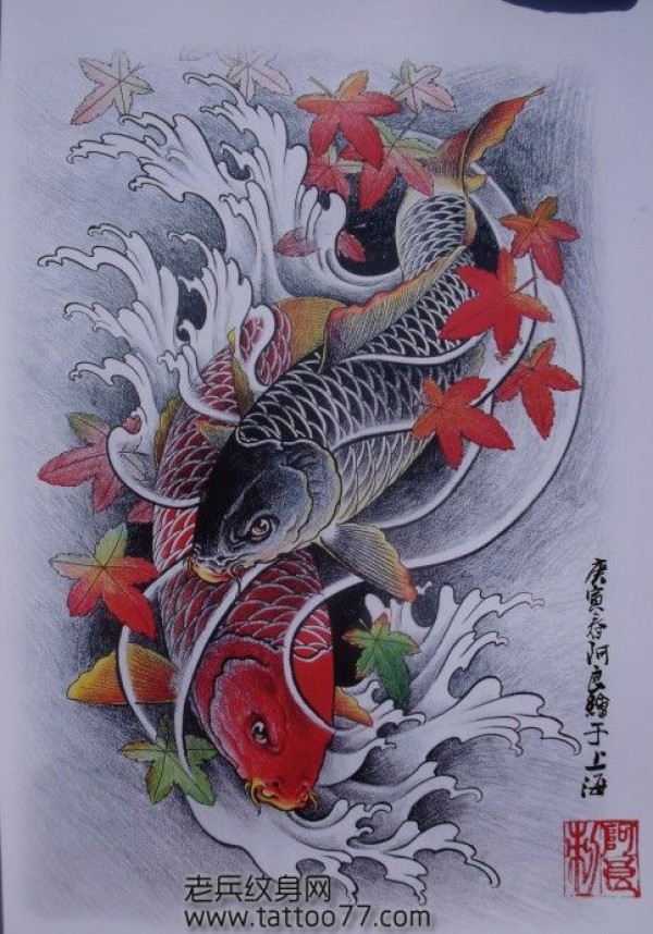 66纹身图库为你提供一款鲤鱼枫叶纹身手稿_鲤鱼纹身图案大全_纹身图吧
