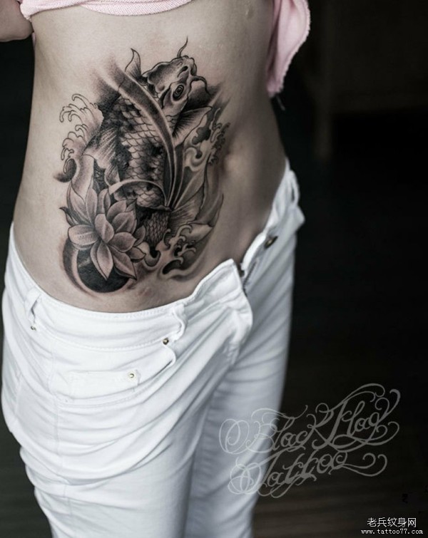 66纹身图库推荐一款女性侧腰鲤鱼莲花纹身图案_鲤鱼纹身图案大全_纹身图吧