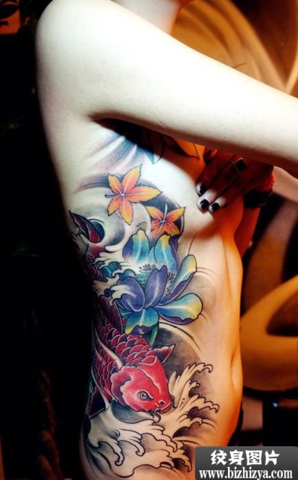 侧腰鲤鱼莲花纹身_鲤鱼纹身图案大全_纹身图吧