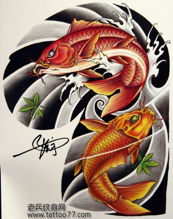 彩色半胛鲤鱼纹身手稿―66纹身图库为你提供_鲤鱼纹身图案大全_纹身图吧