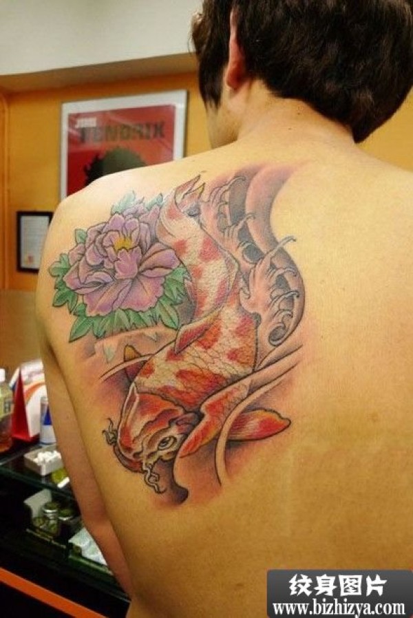 后肩传统牡丹鲤鱼刺青图案图片_鲤鱼纹身图案大全_纹身图吧