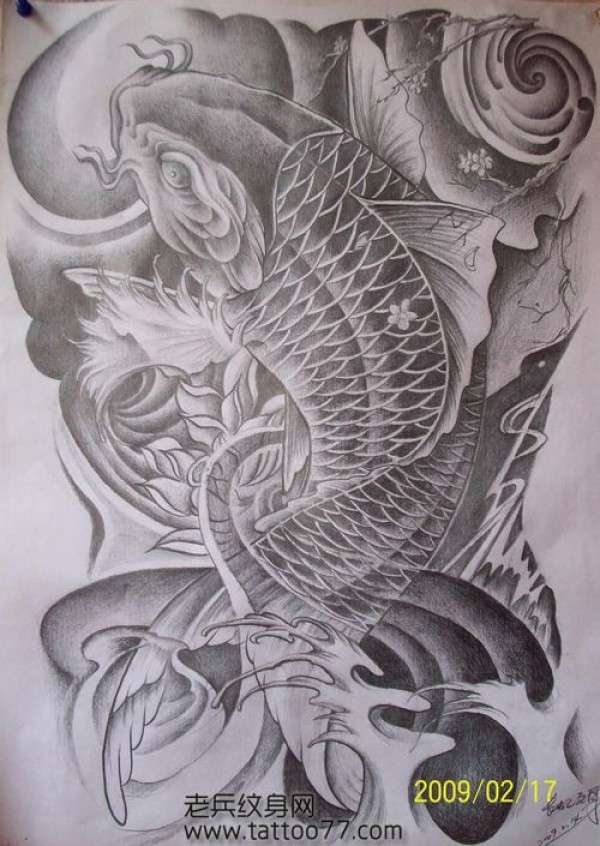 满背鲤鱼纹身手稿_鲤鱼纹身图案大全_纹身图吧