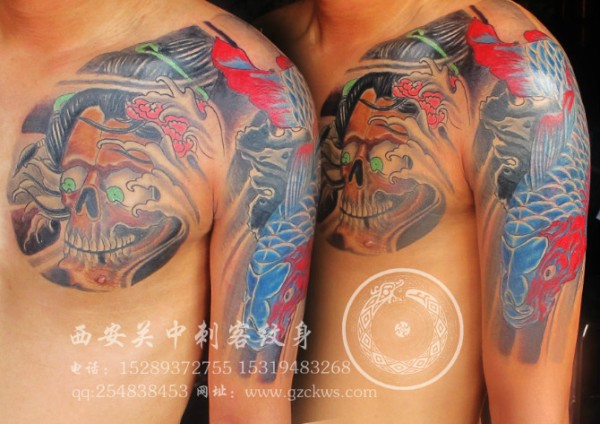 彩色鲤鱼嘎巴拉半胛纹身西安关中刺客纹身_鲤鱼纹身图案大全_纹身图吧