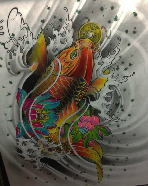 鲤鱼莲花纹身图案手稿_鲤鱼纹身图案大全_纹身图吧