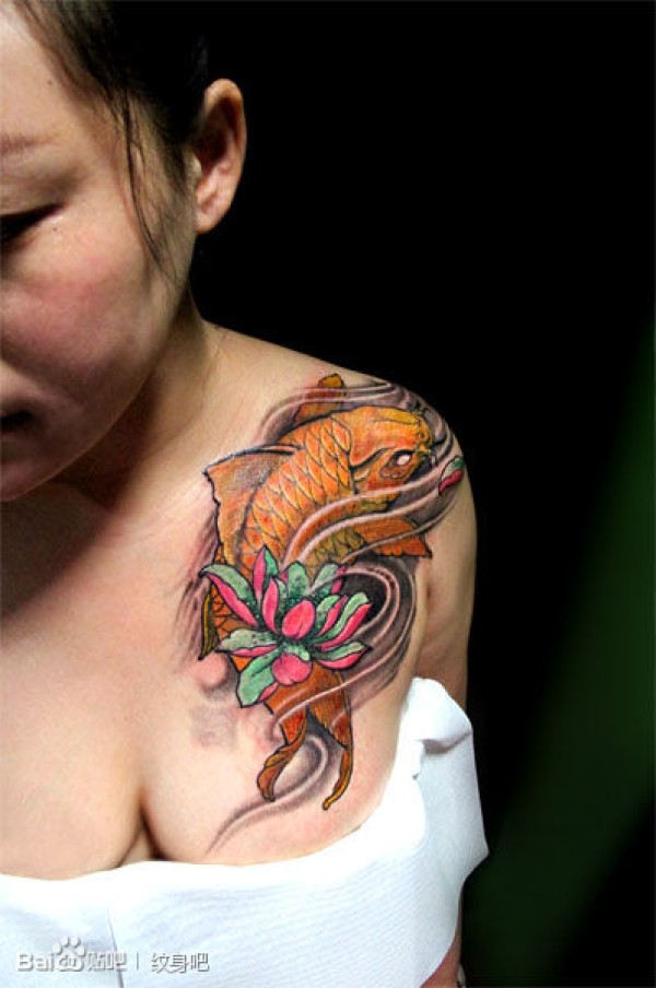 女生肩膀处唯美潮流的鲤鱼纹身图案_鲤鱼纹身图案大全_纹身图吧