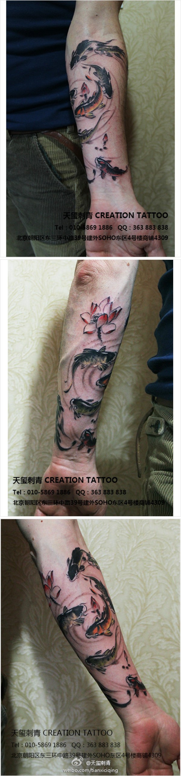 手臂时尚潮流的写意莲花与鲤鱼纹身图案_鲤鱼纹身图案大全_纹身图吧