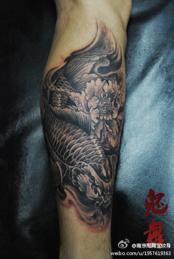男生腿部潮流经典的黑灰鲤鱼纹身图案_鲤鱼纹身图案大全_纹身图吧