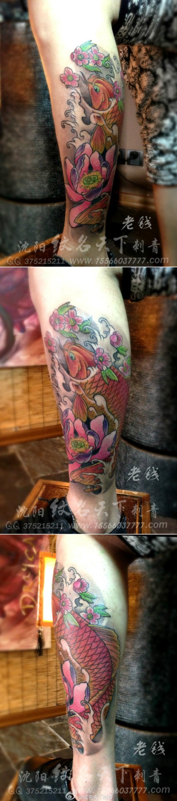 腿部潮流唯美的传统鲤鱼莲花纹身图案_鲤鱼纹身图案大全_纹身图吧