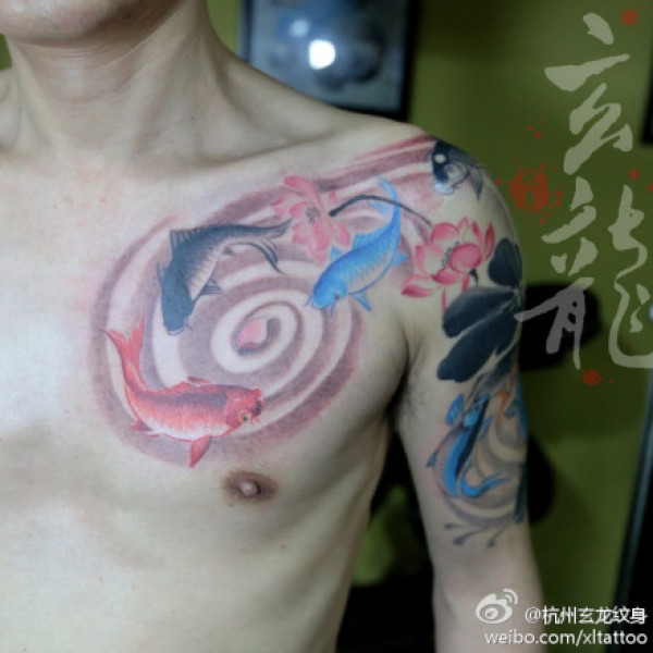 一款精美潮流的半胛水墨莲花鲤鱼纹身图案_鲤鱼纹身图案大全_纹身图吧
